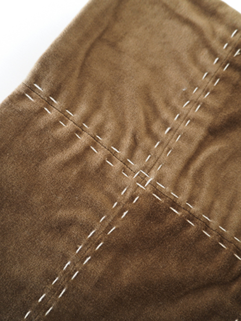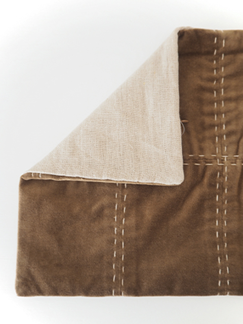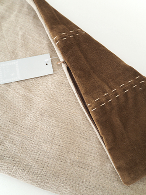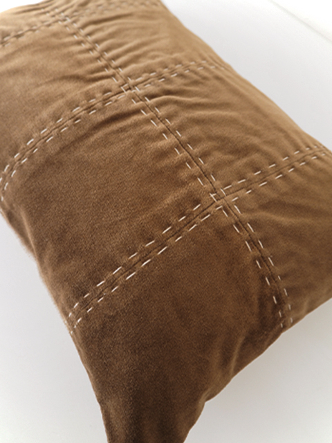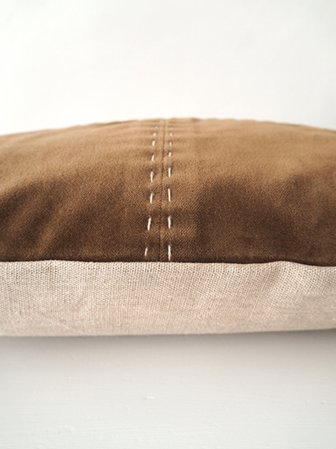 ↑こちらのクッションカバーの表面には、コットンベロア生地の上から、素朴な糸で、刺し子のような手縫いのステッチが施されています。シンプルなクッションカバーの可愛いアクセントになっています。