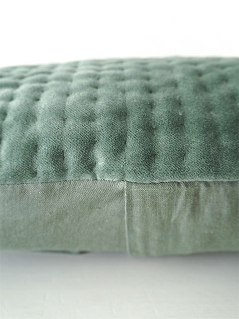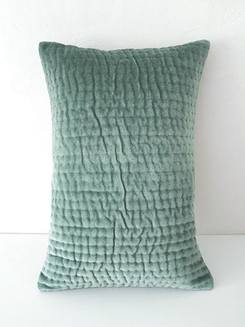 ↑↓フランスのインテリアファブリックメーカー、en fil d'Indienne オンフィル ダンディエンヌの定番の人気商品、Vagueシリーズの、Celadon(セラドン)のベロアピロークッションカバーです(W45xH30cmサイズ)。表面は、オンフィル ダンディエンヌでお馴染みの、肌触りの良い、さらっとしたコットンベロア生地を使用しています。ベロア生地には、インドの職人さんによって、ひと針ひと針、刺し子のようなラインステッチが施されています。ステッチによって生み出された陰影は、さざなみのようでとても素敵です。裏面は、同系色の素朴な無地生地を使用しています。インドの伝統的な技法が詰まった、あじわいの感じられる凝ったクッションカバーながら、シンプルなデザインですので、コーディネートの幅が広がります。フランスの伝統色を用いた繊細なお色のベルベットクッションは、お部屋に叙情的な効果を生み出し、優雅で美しいフランス色の空間に変えてくれますよ。ベッドやソファに並べて、素敵なインテリアのアクセントアイテム、お気に入りのお部屋づくりにぜひ。