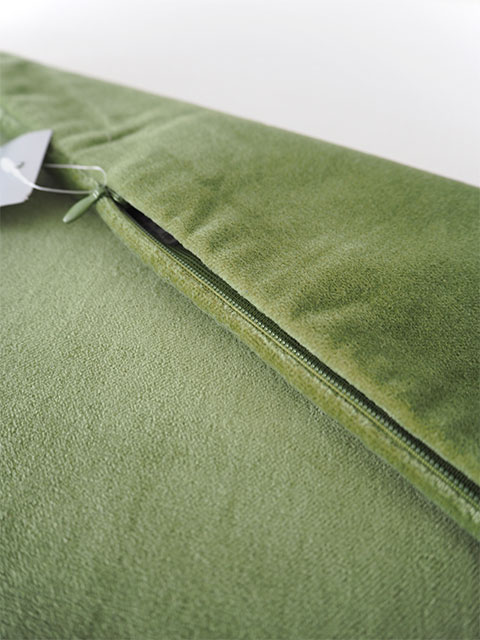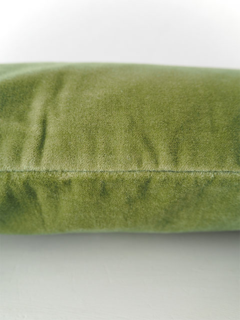 こちらのAvocat(アヴォカ)は、アボカドをイメージした、ニュアンスのあるカーキグリーンと黄緑の中間のようなお色です。光の当たり方で明るい黄緑、フレッシュなアボカドグリーンのように見えたり、少しくすんだ深みのあるグリーンに見えたりと、色の印象が変化するのも魅力です。(*こちらのW50xH35cmタイプのクッションカバーの裏面は、表面と同じコットンベロア生地を使用しています。)