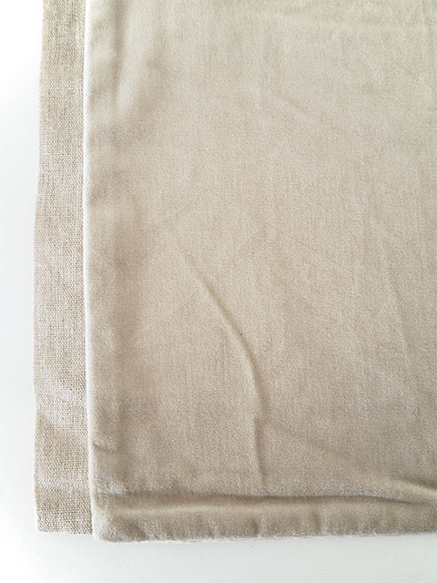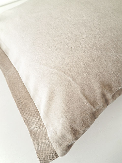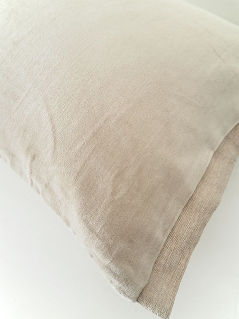 ↑こちらのクッションカバーの左右両サイドには、上画像のようなリネン混生地が使用されています。シンプルなクッションカバーの可愛いアクセントになっています。