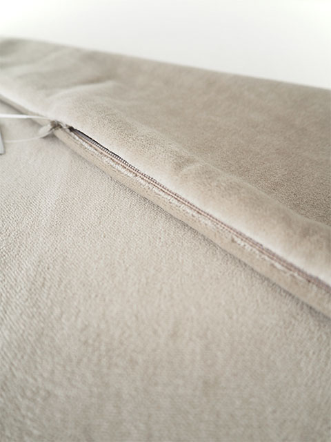 ↑↓フランスのインテリアファブリックメーカー、en fil d'Indienne オンフィル ダンディエンヌのベーシックコレクションの人気商品、Medicis メディシスシリーズの新色、Beige(ベージュ)のベロアピロークッションカバーです。(W50xH35cmサイズ)。表裏面共に、オンフィル ダンディエンヌでお馴染みの、肌触りの良い、さらっとしたコットンベロアの無地生地(1枚仕立て)を使用しています。両サイドには素朴なリネン混生地が使用され、全体の可愛いアクセントになっています。シンプルなクッションカバーですので、色々なテイストのクッションとも相性が良く、コーディネートの幅が広がります。フランスの伝統色を用いた繊細なお色は、お部屋をフランス色に変えてくれますよ。ベッドやソファに並べて、素敵なインテリアのアクセントアイテム、お気に入りのお部屋の空間づくりにぜひ。