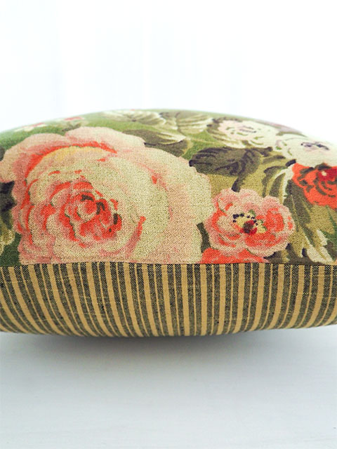 裏面は、表面とはガラリと雰囲気が違う、シンプルなコットンのストライプ生地を使用しています。フランスならではのちょっぴり渋みを感じる、大人可愛い絶妙な色使いで、こちらの面もとても素敵ですよ。表面、裏面と、様々なインテリアアレンジをお楽しみいただけます。