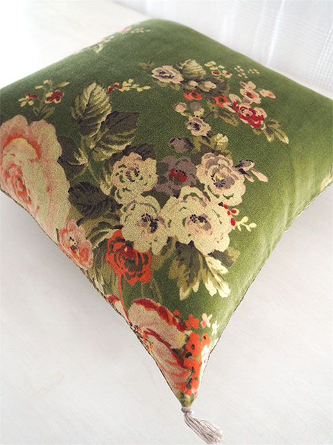 (*こちらの「Bangalore・バンガロール」シリーズの、Avocat・アヴォカ色のベロア クッションカバーの花柄プリントは、掲載画像では輪郭がくっきりと、やや鮮やかに写っていますが、実際は、全体的にグレーがかっていて彩度がやや低く、シックな印象の花柄プリントです。