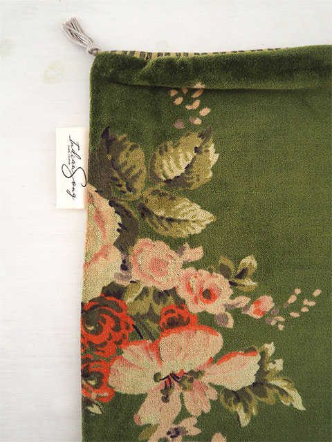 ↑↓表面は、やわらかく、さらっとした肌触りの100%コットンベロア生地をベースに、インドの瑞々しい花木を思わせるような、お花や植物が、華やかかつ繊細なタッチで描かれています。躍動感あふれるお花柄のベロア クッションは、コロンと置くだけで、まるでお部屋に水やりの要らないお庭が出来たような、神秘的な空間へ変わります。