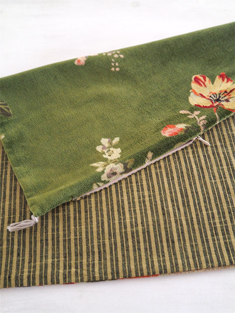 さらっとしたコットンベロアの表生地と、素朴なコットンストライプの裏生地、どこか儚げさも感じる繊細かつ華やかな花柄プリントに、ニュアンスの感じられる色使い、随所に感じられるインドの手仕事と、フランスとインドの魅力が融合したような、とても素敵なベロア クッションカバーに仕上がっています。
