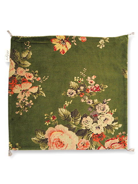 表面は、やわらかく、さらっとした肌触りの100%コットンベロア生地をベースに、インドの瑞々しい花木を思わせるような、お花や植物が、華やかかつ繊細なタッチで描かれています。躍動感あふれるお花柄のベロア クッションは、コロンと置くだけで、まるでお部屋に水やりの要らないお庭が出来たような、神秘的な空間へ変わります。