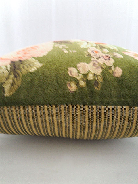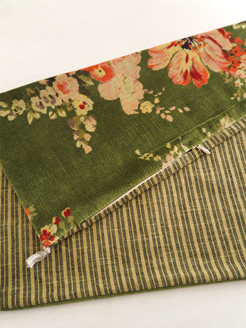 ↑↓こちらの『Bangalore・バンガロール』シリーズのベロア クッションカバーの裏面には、表面とはガラリと雰囲気が違う、シンプルなコットンのストライプ生地を使用しています。フランスならではのちょっぴり渋みを感じる、大人可愛い絶妙な色使いで、こちらの面もとても素敵ですよ。