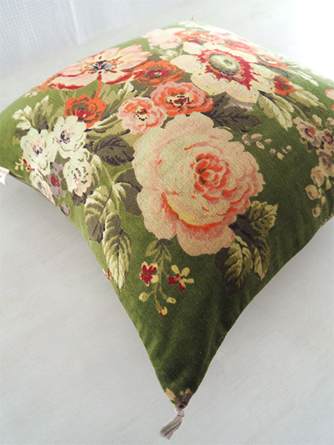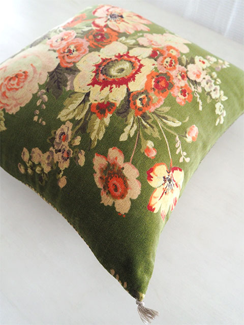 (*こちらの「Bangalore・バンガロール」シリーズの、Avocat・アヴォカ色のベロア クッションカバーの花柄プリントは、掲載画像では輪郭がくっきりと、やや鮮やかに写っていますが、実際は、全体的にグレーがかっていて彩度がやや低く、シックな印象の花柄プリントです。