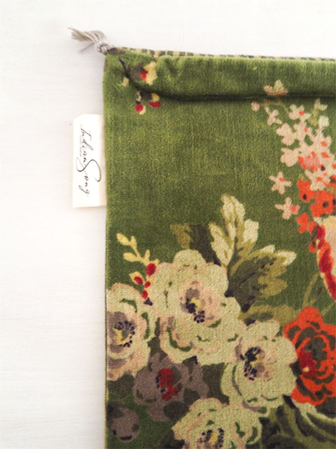 ↑『Indian Song・インディアンソング』のブランド布タグも縫い付けられています。(*こちらのベロア クッションカバーは、外側の端にブランド布タグが縫い付けられています。)