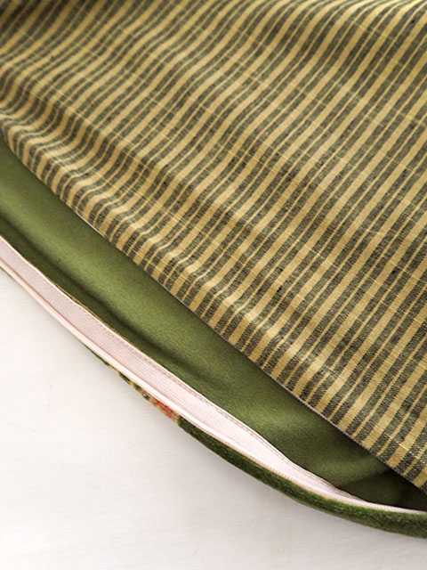 裏面は、表面とはガラリと雰囲気が違う、シンプルなコットンのストライプ生地を使用しています。フランスならではのちょっぴり渋みを感じる、大人可愛い絶妙な色使いで、こちらの面もとても素敵ですよ。表面、裏面と、様々なインテリアアレンジをお楽しみいただけます。
