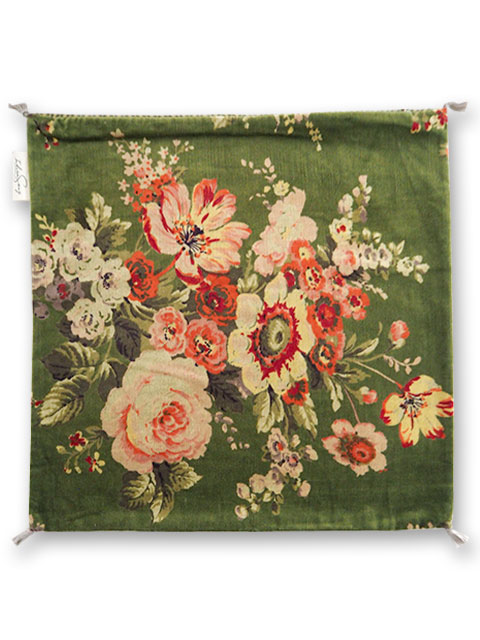 ↑↓表面は、やわらかく、さらっとした肌触りの100%コットンベロア生地をベースに、インドの瑞々しい花木を思わせるような、お花や植物が、華やかかつ繊細なタッチで描かれています。躍動感あふれるお花柄のベロア クッションは、コロンと置くだけで、まるでお部屋に水やりの要らないお庭が出来たような、神秘的な空間へ変わります。