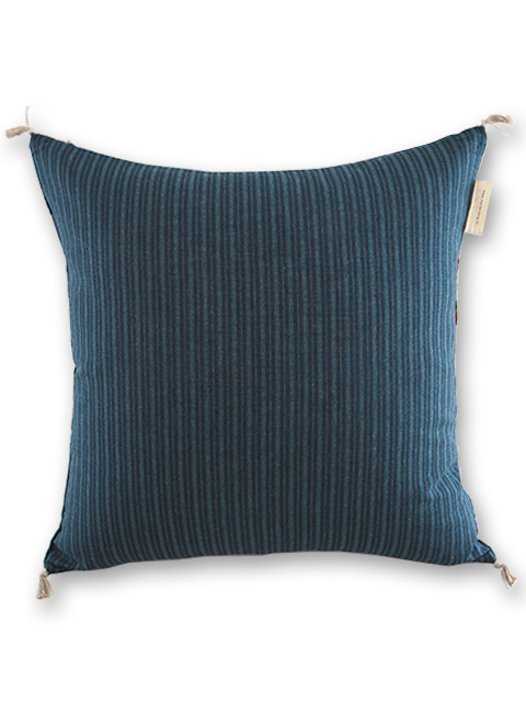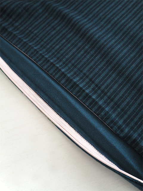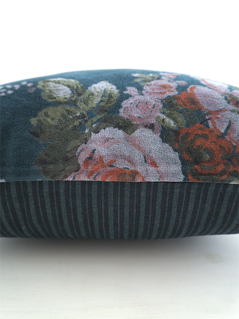 ↑↓こちらの『Bangalore・バンガロール』シリーズのベロア クッションカバーの裏面には、フランスらしい色彩、ブルーとグリーンに少しグレーが混じったような、ニュアンスを感じるTeal・ティール色と、ネイビーがちょっと混じったような墨黒のストライプ生地が使用されています。