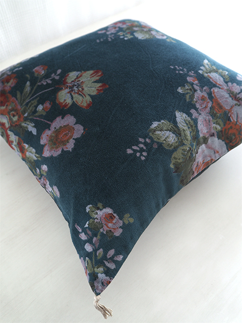 (*こちらの「Bangalore・バンガロール」シリーズの、Canard・カナール色のベロア クッションカバーの花柄プリントは、掲載画像では輪郭がくっきりと、やや鮮やかに写っていますが、実際は、全体的にグレーがかっていて彩度が低く、ネイビー地にほんのり花柄が浮き上がるような、シックな印象の花柄です。お手元でご覧いただいた際に、ホームページの画像の印象よりも地味に感じられるかもしれません。