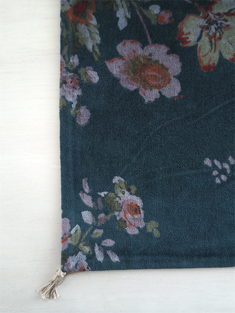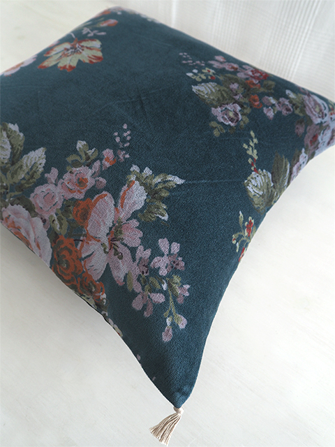 他のお色よりも華やかさは劣りますが、静かな美しさを感じる、上品で大人っぽい、とても素敵な花柄に仕上がっています。コントラストが強くない、ネイビーベースの花柄ですので、他の絵柄とも馴染みやすく、色々なテイストのクッションとコーディネートしやすいのも魅力です。