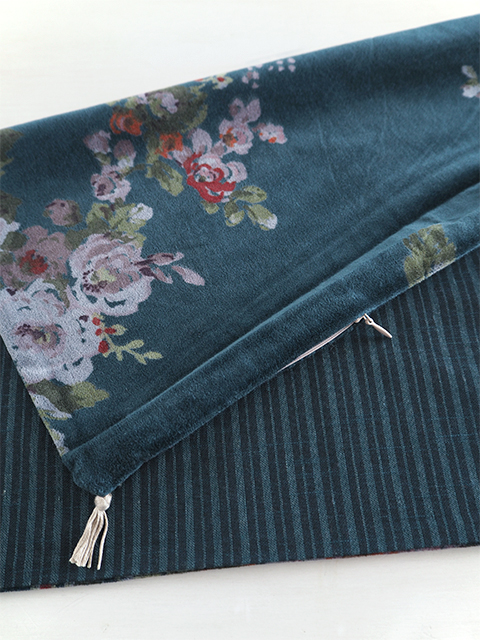 ↑↓表面は、やわらかく、さらっとした肌触りの100%コットンベロア生地をベースに、インドの瑞々しい花木を思わせるような、お花や植物が、華やかかつ繊細なタッチで描かれています。躍動感あふれるお花柄のベロア クッションは、コロンと置くだけで、まるでお部屋に水やりの要らないお庭が出来たような、神秘的な空間へ変わります。