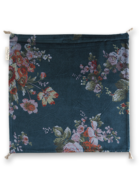 表面は、やわらかく、さらっとした肌触りの100%コットンベロア生地をベースに、インドの瑞々しい花木を思わせるような、お花や植物が、華やかかつ繊細なタッチで描かれています。躍動感あふれるお花柄のベロア クッションは、コロンと置くだけで、まるでお部屋に水やりの要らないお庭が出来たような、神秘的な空間へ変わります。