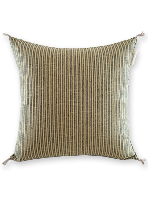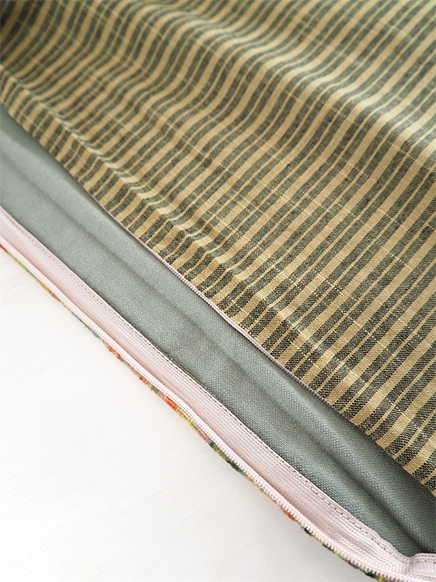裏面は、表面とはガラリと雰囲気が違う、シンプルなコットンのストライプ生地を使用しています。フランスならではのちょっぴり渋みを感じる、大人可愛い絶妙な色使いで、こちらの面もとても素敵ですよ。表面、裏面と、様々なインテリアアレンジをお楽しみいただけます。