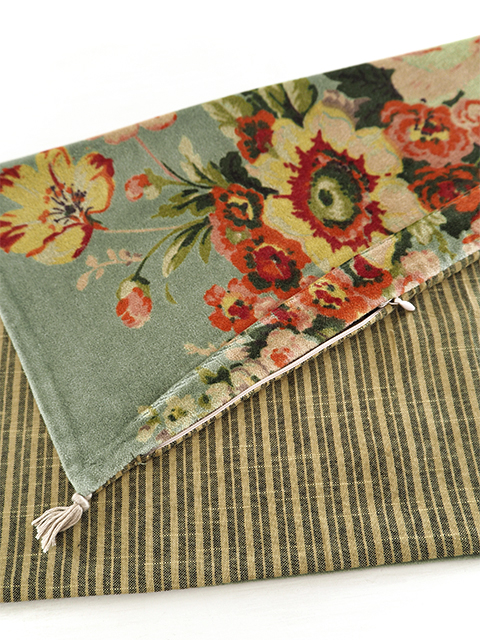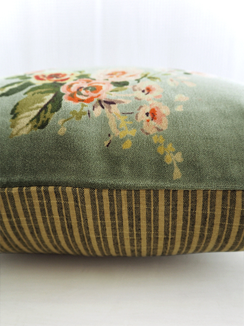 ↑↓こちらの『Bangalore・バンガロール』シリーズのベロア クッションカバーの裏面には、表面とはガラリと雰囲気が違う、シンプルなコットンのストライプ生地を使用しています。フランスならではのちょっぴり渋みを感じる、大人可愛い絶妙な色使いで、こちらの面もとても素敵ですよ。
