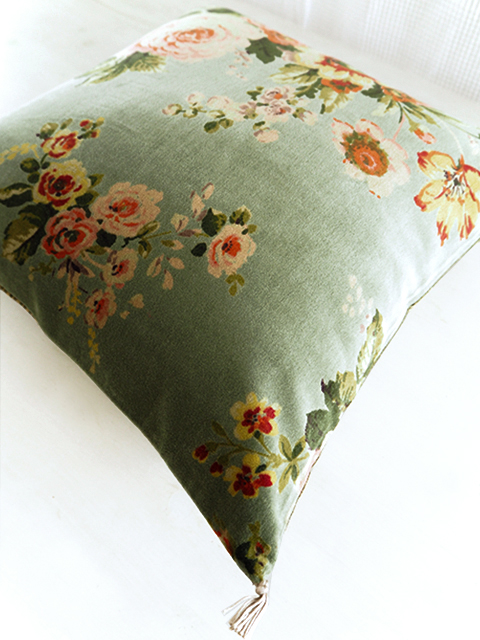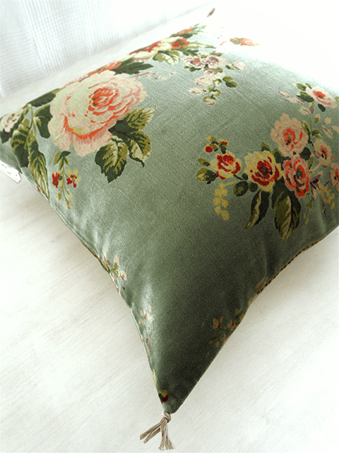 (*こちらの「Bangalore・バンガロール」シリーズの、Celadon・セラドン色のベロア クッションカバーの花柄プリントは、掲載画像では輪郭がくっきりと、やや鮮やかに写っていますが、実際は、全体的にグレーがかっていて彩度がやや低く、シックな印象の花柄プリントです。