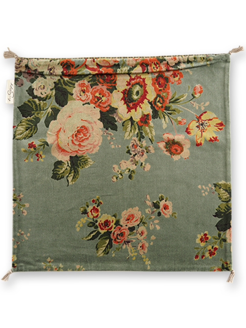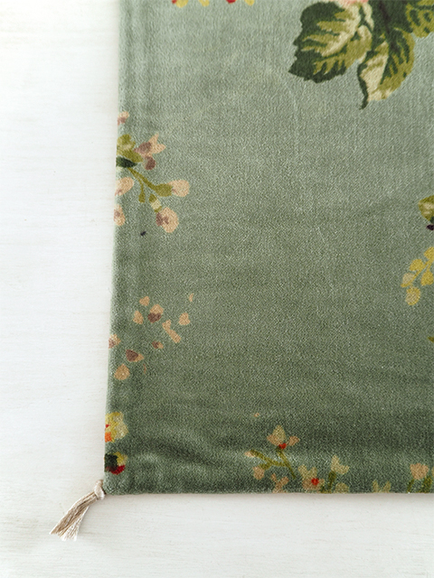 表面は、やわらかく、さらっとした肌触りの100%コットンベロア生地をベースに、インドの瑞々しい花木を思わせるような、お花や植物が、華やかかつ繊細なタッチで描かれています。躍動感あふれるお花柄のベロア クッションは、コロンと置くだけで、まるでお部屋に水やりの要らないお庭が出来たような、神秘的な空間へ変わります。