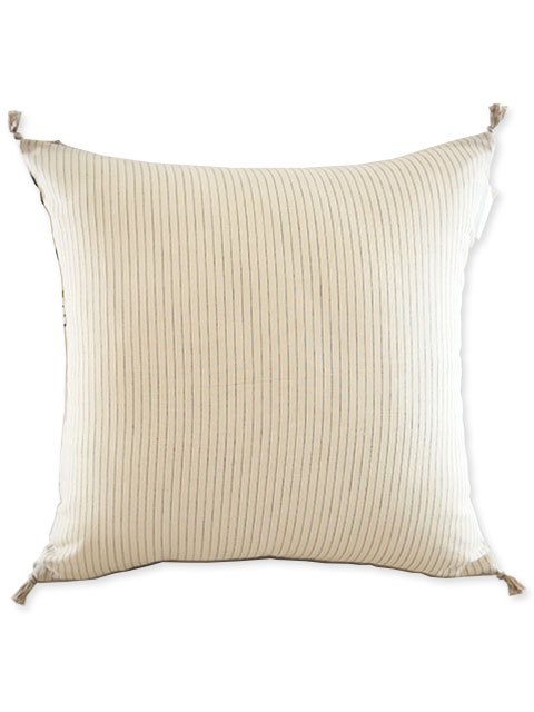 ↑↓こちらの『Bangalore ete・バンガロール エテ』シリーズのコットン クッションカバーの裏面には、エクリュとクリーム色の中間色のような、ほのかに黄色味を感じる、淡いベージュ色の薄手コットン生地に、フランスらしい色彩、アントラシート色のピンストライプ柄が描かれています。