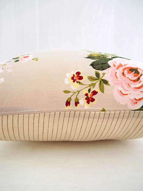 裏面は、表面とはガラリと雰囲気が違う、ピンストライプ柄の薄手コットン生地を使用しています。フランスならではの、シンプルシックな大人可愛い色柄で、こちらの面もとても素敵ですよ。表面、裏面と、様々なインテリアアレンジをお楽しみいただけます。