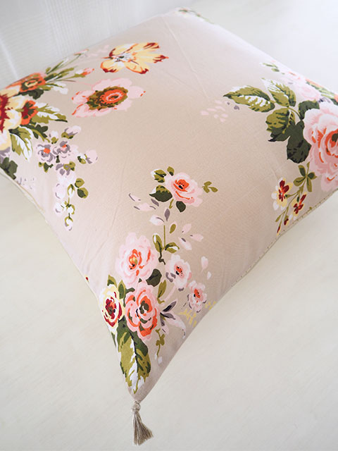 さらっとしたコットンの表生地と、素朴な薄手コットンピンストライプの裏生地、どこか儚げさも感じる繊細かつ華やかな花柄プリントに、ニュアンスの感じられる色使い、随所に感じられるインドの手仕事と、フランスとインドの魅力が融合したような、とても素敵なコットン クッションカバーに仕上がっています。