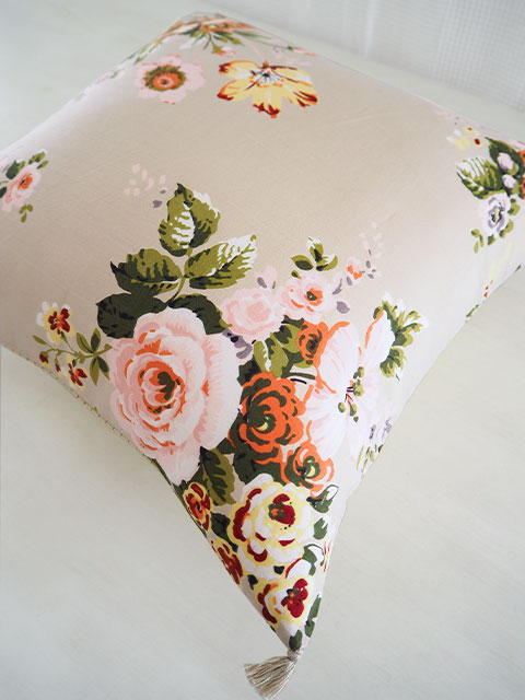 表面は、さらっとした肌触りの100%コットン生地をベースに、インドの瑞々しい花木を思わせるような、お花や植物が、華やかかつ繊細なタッチで描かれています。躍動感あふれるお花柄のコットン クッションは、コロンと置くだけで、まるでお部屋に水やりの要らないお庭が出来たような、神秘的な空間へ変わります。