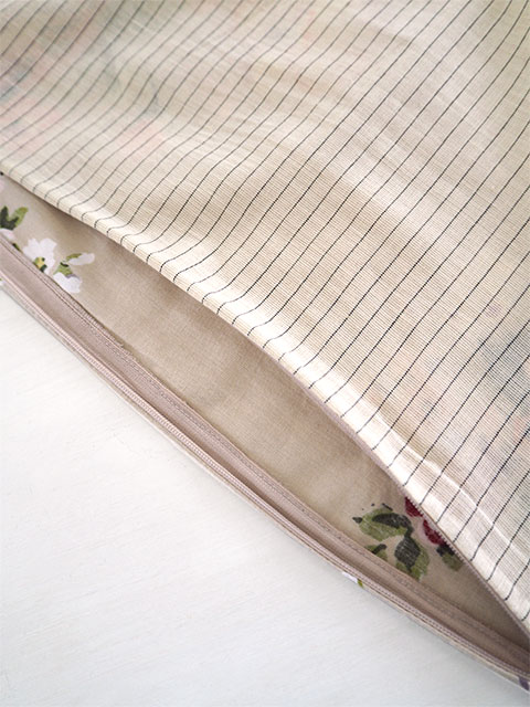 ↑↓こちらのコットンクッションカバーはチャック開閉式です。中材はこちらから出し入れ可能です。