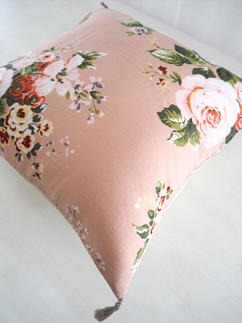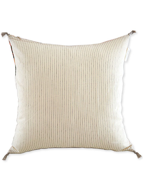 さらっとしたコットンの表生地と、素朴な薄手コットンピンストライプの裏生地、どこか儚げさも感じる繊細かつ華やかな花柄プリントに、ニュアンスの感じられる色使い、随所に感じられるインドの手仕事と、フランスとインドの魅力が融合したような、とても素敵なコットン クッションカバーに仕上がっています。