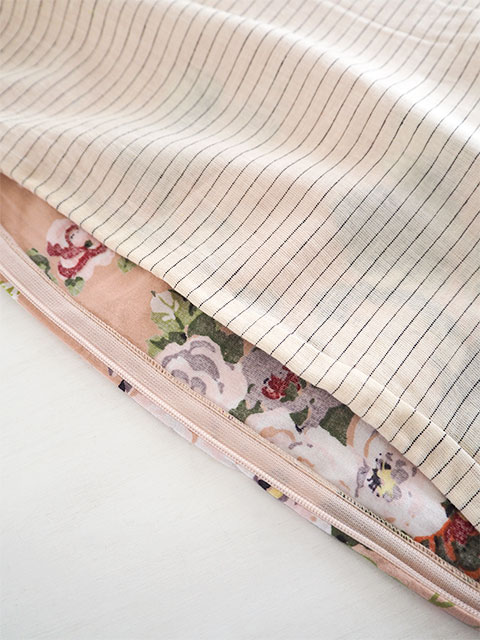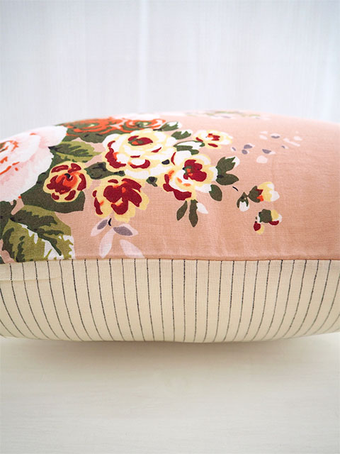 裏面は、表面とはガラリと雰囲気が違う、ピンストライプ柄の薄手コットン生地を使用しています。フランスならではの、シンプルシックな大人可愛い色柄で、こちらの面もとても素敵ですよ。表面、裏面と、様々なインテリアアレンジをお楽しみいただけます。