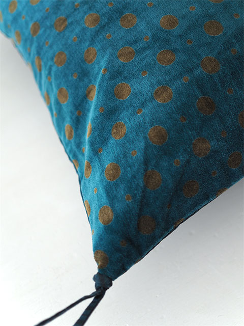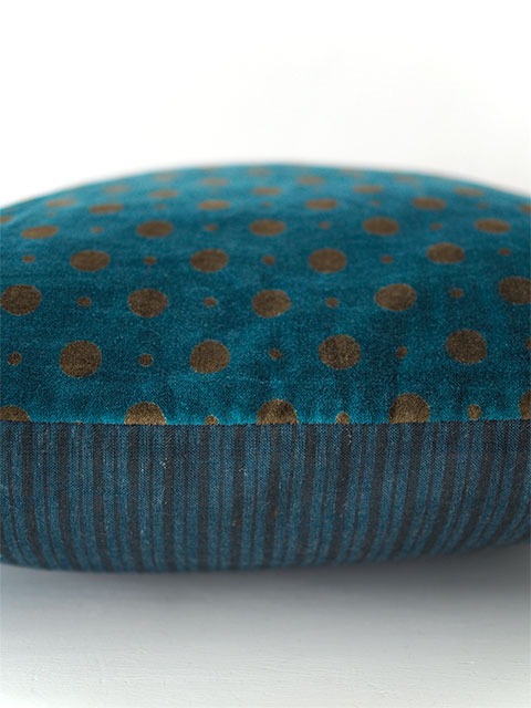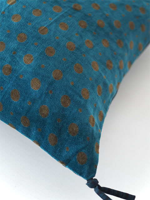 やわらかく、さらっとした肌触りのコットンベロアの水玉柄の表生地と、素朴なコットンのストライプ柄の裏生地。大人かわいい水玉柄のベロア クッションカバーは、どんなスタイルのインテリアにも合わせられ、『Indian Song・インディアンソング』の他の全てのコレクションとも簡単にミックス出来ます。ニュアンスの感じられる色使い、随所に感じられるインドの手仕事と、フランスとインドの魅力が融合したような、とても素敵なベロア クッションカバーに仕上がっています。