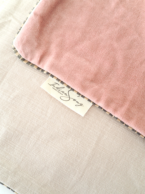 ↑『Indian Song・インディアンソング』のブランド布タグも縫い付けられています。(*こちらのベロア ピロークッションカバー は、外側の端にブランド布タグが縫い付けられています。)