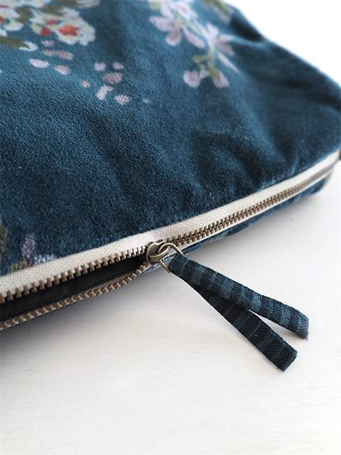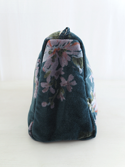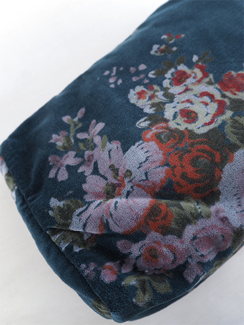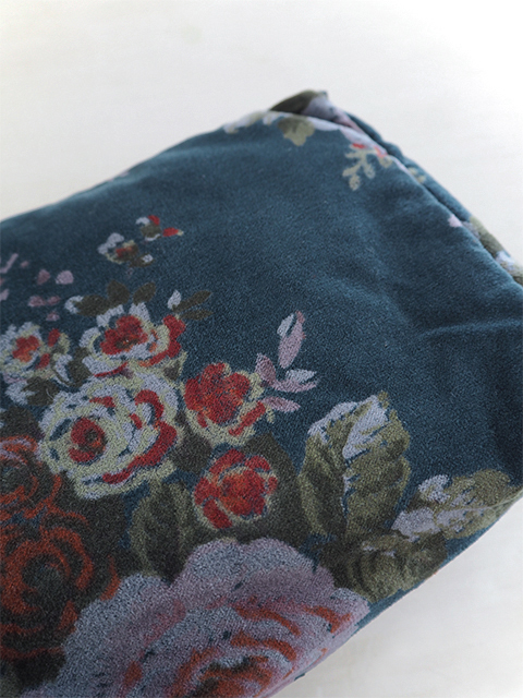 やわらかく、さらっとした肌触りの、花柄コットンベロアの表裏生地と、カサカサっとした質感の、シンプル無地の内側生地。どこか儚げさも感じる繊細かつ華やかな花柄のベロア ポーチは、持っているだけで、ちょっとテンションがあがりそう。バッグの中が、お花が咲いたようにパッと明るくなりますよ。