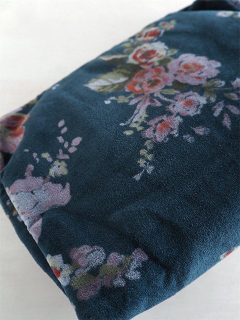 ↑↓ネイビー寄りのCanard・カナール色のコットンベロア生地をベースに、インドの瑞々しい花木を思わせるような、お花や植物が、華やかかつ繊細なタッチで描かれています。躍動感あふれるお花柄のコットンベロア生地は、どこか神秘的な雰囲気を醸し出していて、とても素敵です。
