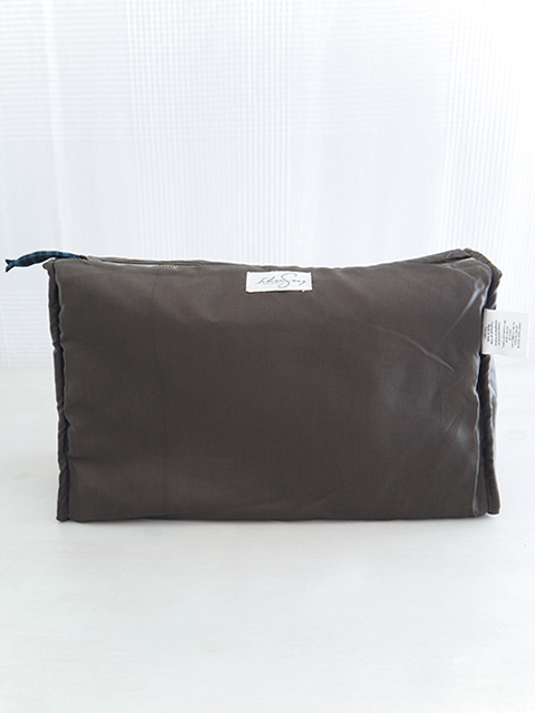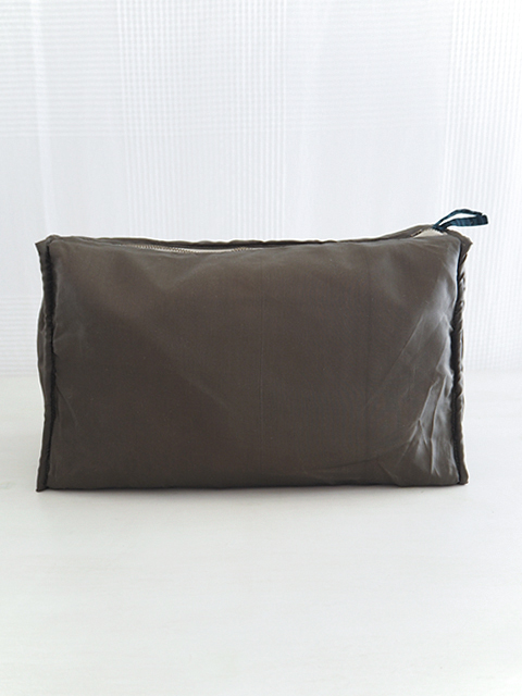 ↑↓こちらはポーチの内側です。内側は、ブラウンとカーキ色を混ぜたような、ポリエステル100%の無地生地が使用されています。シンプルかつ深みのあるお色で、ポーチ内の小物がよく引き立ちます。