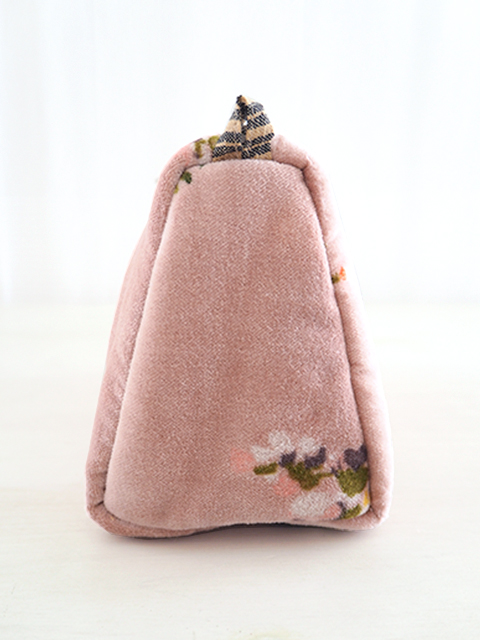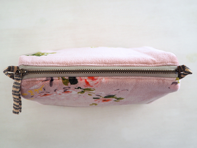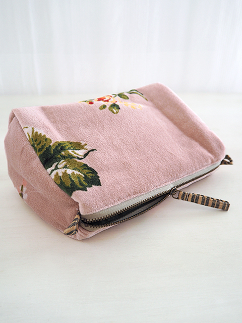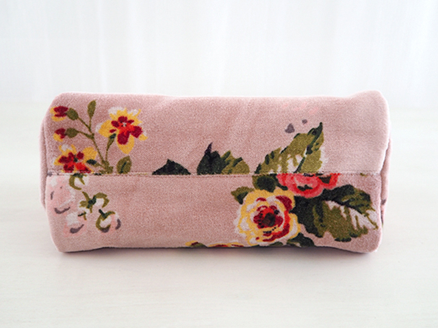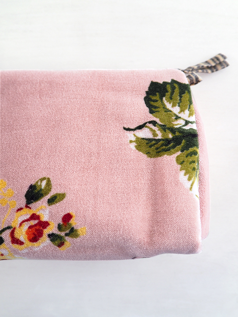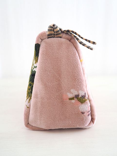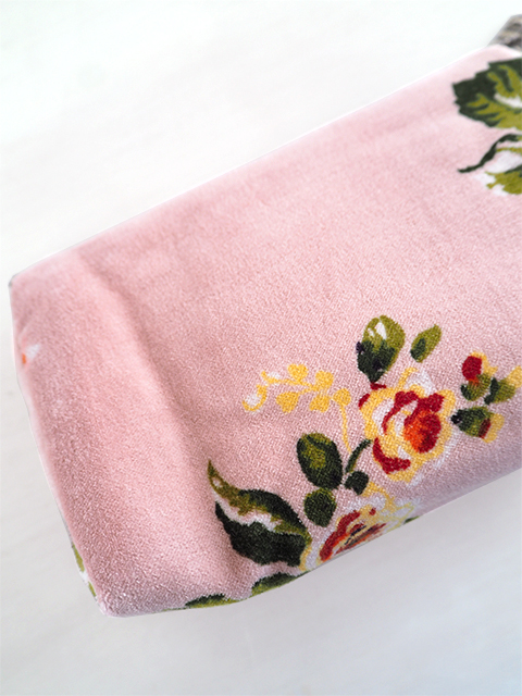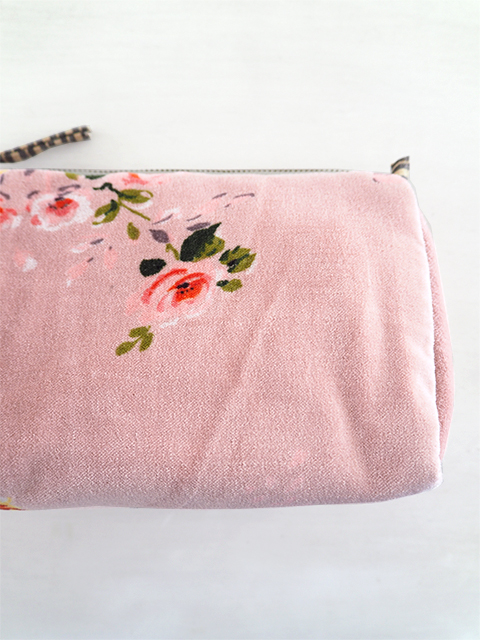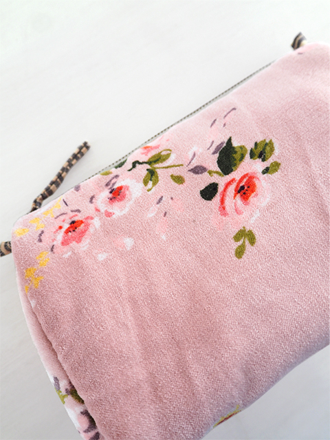 やわらかく、さらっとした肌触りの、花柄コットンベロアの表裏生地と、カサカサっとした質感の、シンプル無地の内側生地。どこか儚げさも感じる繊細かつ華やかな花柄のベロア ポーチは、持っているだけで、ちょっとテンションがあがりそう。バッグの中が、お花が咲いたようにパッと明るくなりますよ。