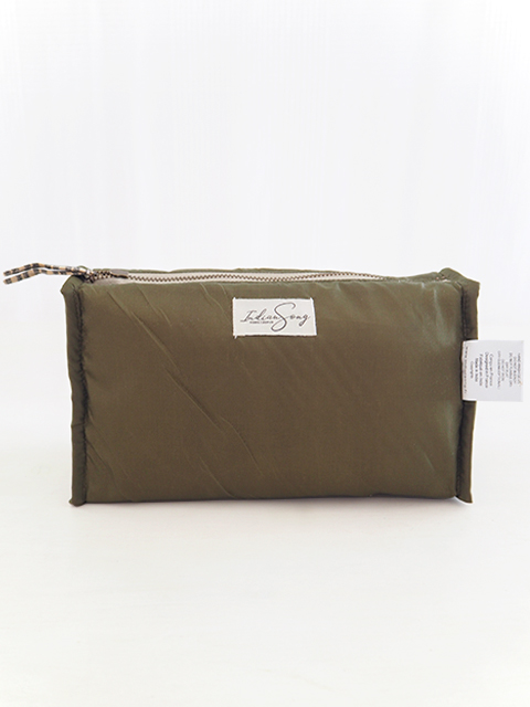 ↑↓こちらはポーチの内側です。内側は、ブラウンとカーキ色を混ぜたような、ポリエステル100%の無地生地が使用されています。シンプルかつ深みのあるお色で、ポーチ内の小物がよく引き立ちます。