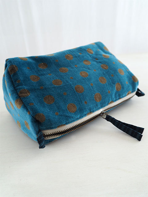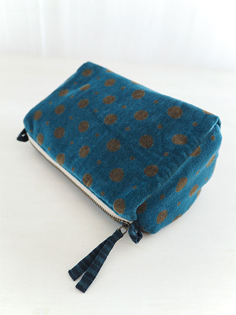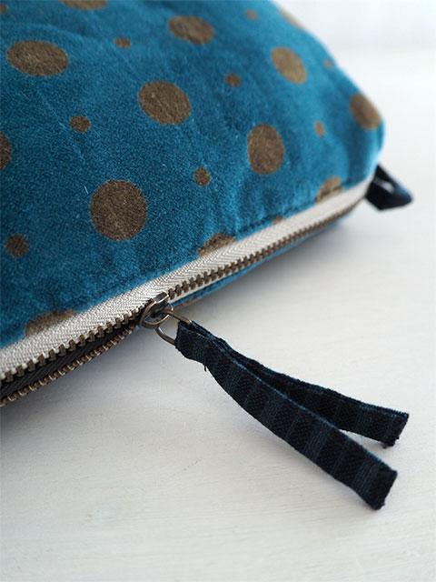 やわらかく、さらっとした肌触りの、水玉柄コットンベロアの表裏生地と、カサカサっとした質感の、シンプル無地の内側生地。大人可愛い水玉柄のベロア ポーチは、持っているだけで、ちょっとテンションがあがりそう。バッグの中も華やぎます。ニュアンスの感じられる色使い、随所に感じられるインドの手仕事と、フランスとインドの魅力が融合したような、とても素敵なベロア ポーチに仕上がっています。
