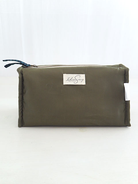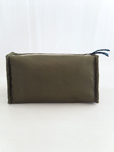↑↓こちらはポーチの内側です。内側は、ブラウンとカーキ色を混ぜたような、ポリエステル100%の無地生地が使用されています。シンプルかつ深みのあるお色で、ポーチ内の小物がよく引き立ちます。