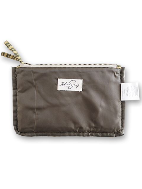 ↑↓こちらはポーチの内側です。内側は、ブラウンとカーキ色を混ぜたような、ポリエステル100%の無地生地が使用されています。シンプルかつ深みのあるお色で、ポーチ内の小物がよく引き立ちます。