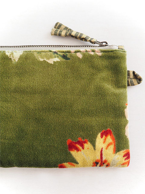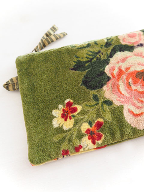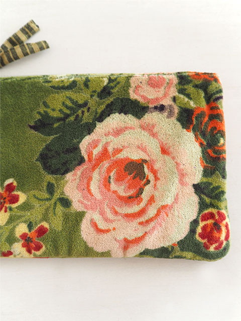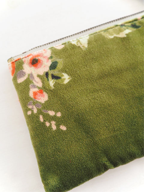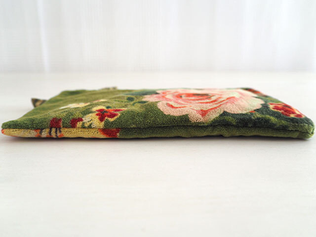 やわらかく、さらっとした肌触りの、花柄コットンベロアの表裏生地と、カサカサっとした質感の、シンプル無地の内側生地。どこか儚げさも感じる繊細かつ華やかな花柄のベロア ポーチは、持っているだけで、ちょっとテンションがあがりそう。バッグの中が、お花が咲いたようにパッと明るくなりますよ。