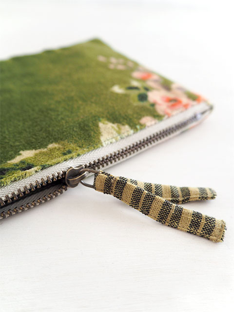 そして、こちらのベロア ポーチはチャック開閉式です。チャックの持ち手には、フランスらしい、シックな色合いのストライプ生地のリボンが付いていて、ベロア ポーチ全体の可愛いアクセントになっています。
