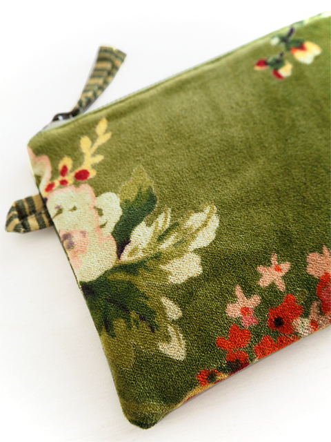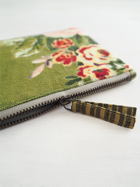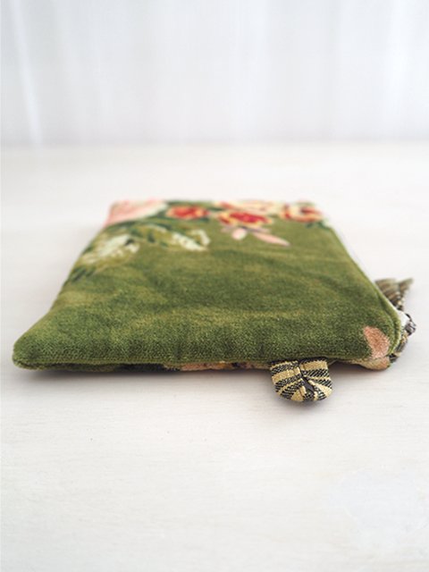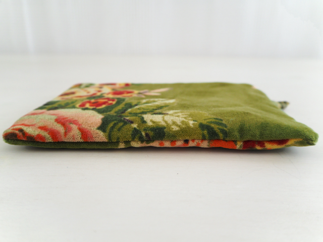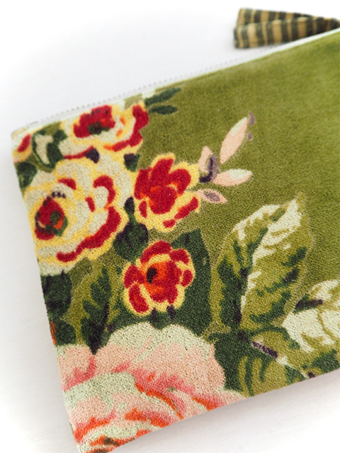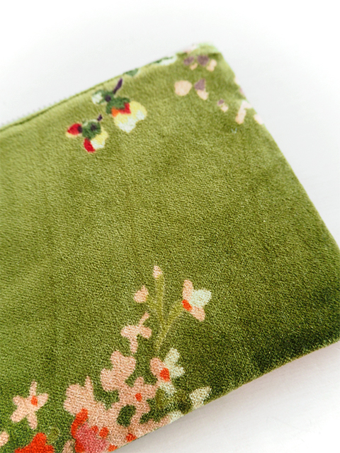やわらかく、さらっとした肌触りの、花柄コットンベロアの表裏生地と、カサカサっとした質感の、シンプル無地の内側生地。どこか儚げさも感じる繊細かつ華やかな花柄のベロア ポーチは、持っているだけで、ちょっとテンションがあがりそう。バッグの中が、お花が咲いたようにパッと明るくなりますよ。