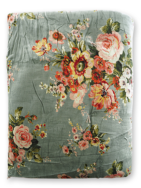 (*こちらの「Bangalore・バンガロール」シリーズの、Celadon・セラドン色のベロア キルト マルチカバーの花柄プリントは、掲載画像では輪郭がくっきりと、やや鮮やかに写っていますが、実際は、全体的にグレーがかっていて彩度がやや低く、シックな印象の花柄プリントです。