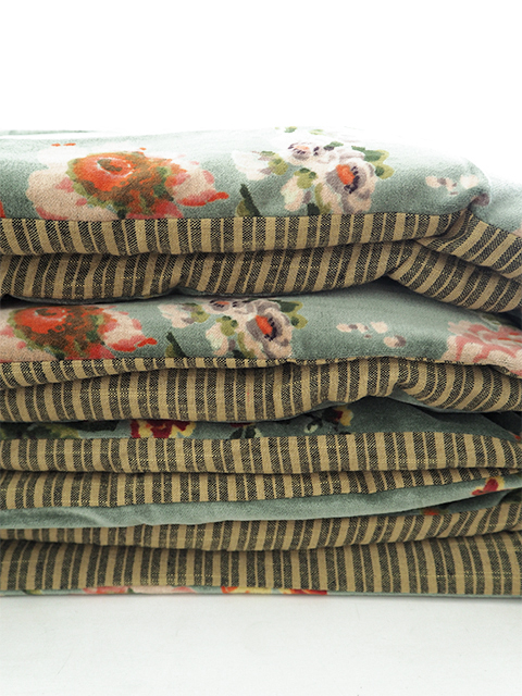 さらっとしたコットンベロアの表生地と、素朴なコットンストライプの裏生地、どこか儚げさも感じる繊細かつ華やかな花柄プリントに、ニュアンスの感じられる色使い、随所に感じられるインドの手仕事と、フランスとインドの魅力が融合したような、とても素敵なベロア キルト マルチカバーに仕上がっています。