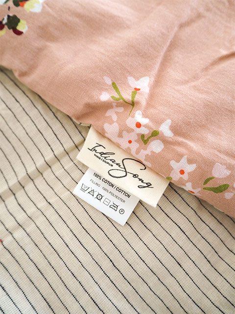 (*『Indian Song・インディアンソング』製品は、インドで1点1点、手作業で製作されています。その為、中綿の厚み、全体のサイズ、ミシン縫製、手縫い刺繍など、作り手さんによって、作品の表情が若干異なります。また、絵柄の取り方やプリントの濃淡、色ムラや擦れなど、それぞれ多少の誤差がございます。これらは『Indian Song・インディアンソング』製品によく見られる、製品の特性となりますので、ご注文いただく際は、予めご了承くださいますよう、どうぞ宜しくお願いいたします。