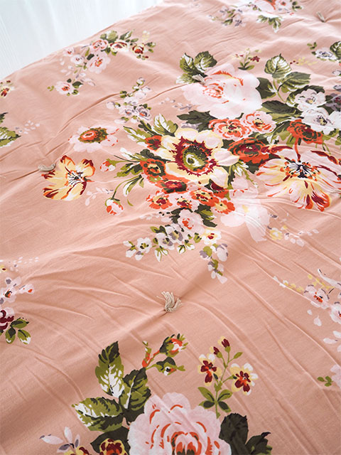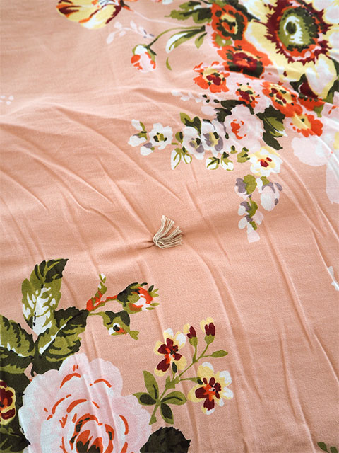 ↑↓『Indian Song・インディアンソング』の代名詞のような花柄シリーズ、「Bangalore・バンガロール」。躍動感あるれるお花柄のコットン キルト マルチカバーは、さらっと掛けるだけで、まるでお部屋に水やりの要らないお庭ができたような、神秘的な空間へ変わります。どこか儚さも感じる繊細かつ華やかな花柄プリントに、ニュアンスのある色使い、随所に感じられるインドの手仕事と、フランスとインドの魅力が融合したような、とても素敵なコットン キルト マルチカバーに仕上がっています。
