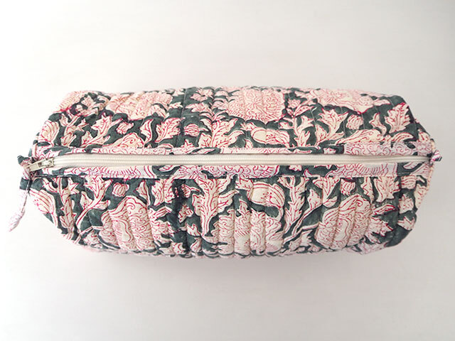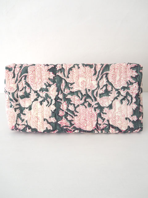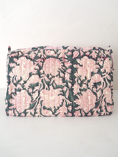 こちらのビッグポーチは、大きめサイズ、マチもありますので、小物がたくさん入ります。化粧ポーチの他にも、サニタリーグッズや旅行用のポーチ、小物の収納ポーチにオススメです。表面は、グレーとモスグリーンが混じったようなニュアンス色に、白と赤の線画で描かれたインドらしいお花がデザインされた、ブロックプリント生地が使用されています。インドの伝統的技法であるブロックプリントは、彫刻された木のブロックを使い、熟練された職人さんによって丁寧に手刷りされています。ブロックプリントならではの独特の美しさ、あじわいが感じられる、とても素敵なポーチに仕上がっています。内側は、撥水加工の布で覆われ、ポケットも付いていますので機能的です。お気に入りの小物の収納袋、お気に入りのバッグのお供にぜひ!