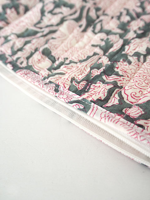 ↑↓表面は、インドの伝統的技法であるブロックプリントの花柄生地を使用しています。ブロックプリントならではのあじわい、素朴な可愛らしさが感じられるポーチに仕上がっています。